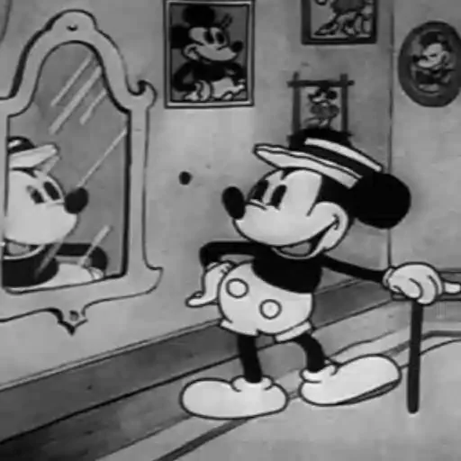 Mickey Mouse, vestido com um chapéu e uma bengala, olha para o seu reflexo em um espelho antigo. Ele está usando uma calça branca com botões e um colete preto.