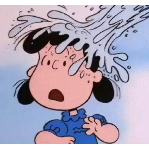 Menina de expressão surpresa e assustada, com água caindo na cabeça. Ela tem cabelo preto preso em coque e veste uma blusa azul.