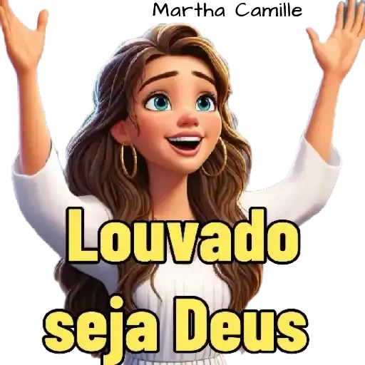 Uma mulher loira com as mãos levantadas e um sorriso no rosto, vestindo uma blusa branca. Sobreposta à imagem está o texto 'Louvado seja Deus' em letras amarelas.