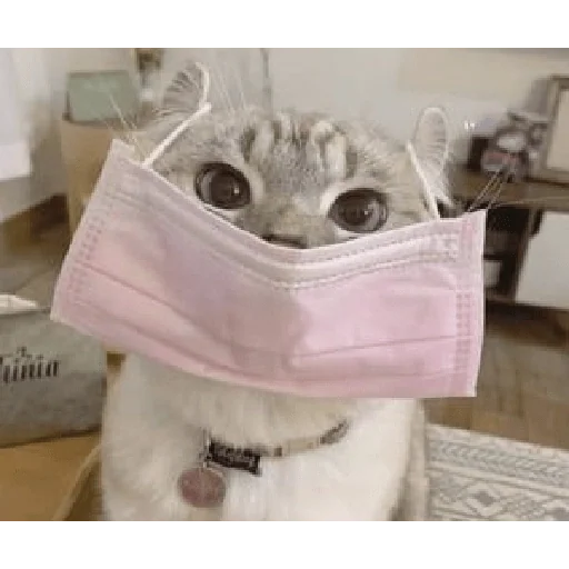 Gato branco com máscara facial rosa sobre a boca e nariz, com olhos arregalados e focados na câmera. Ele usa uma coleira com uma plaquinha.