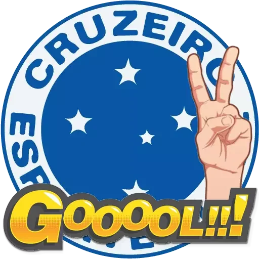 Uma mão fazendo o gesto de 'V' com os dedos, com a palavra 'Goooal!!!' em letras amarelas abaixo. Ao fundo, um escudo com a palavra 'CRUZEIRO' e estrelas.