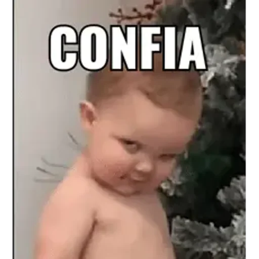 Menino nu com expressão séria e o texto 'CONFIA' sobreposto.