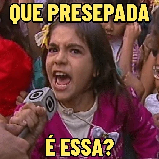 Menina com expressão surpresa e brava, sendo entrevistada, com legenda 'QUE PRESEPADA É ESSA?'