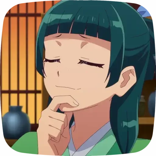 Uma menina de anime com cabelos verdes e bangs, vestindo um kimono verde, com a mão no queixo e expressão pensativa.
