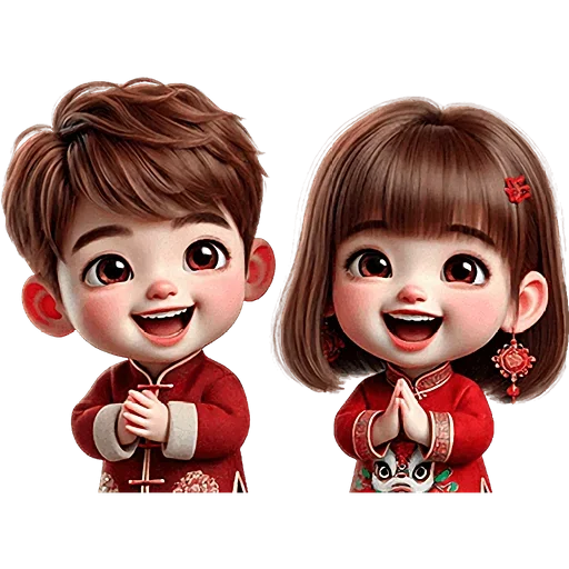 Dois personagens de anime infantil, um menino e uma menina, vestidos com roupas vermelhas tradicionais chinesas, com detalhes dourados e decorações. Eles têm expressões alegres e sorriem.