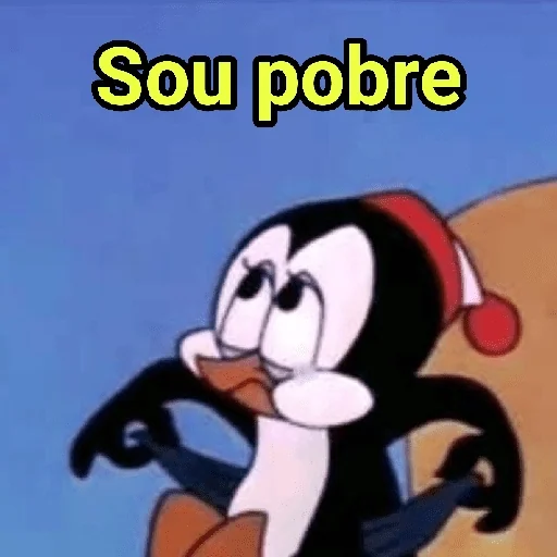 Pinguim de desenho animado com expressão de tristeza ou preocupação, usando um gorro de natal vermelho e branco, com o texto 'Sou pobre' em amarelo.