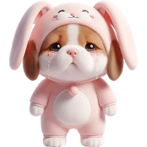 Um coelho de pelúcia vestindo um macacão rosa com orelhas de coelho na cabeça, com expressão triste e olhos grandes.