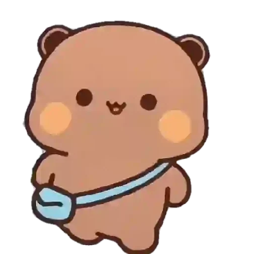 Um ursinho de pelúcia com bolsa azul, cor marrom claro e bochechas rosadas.