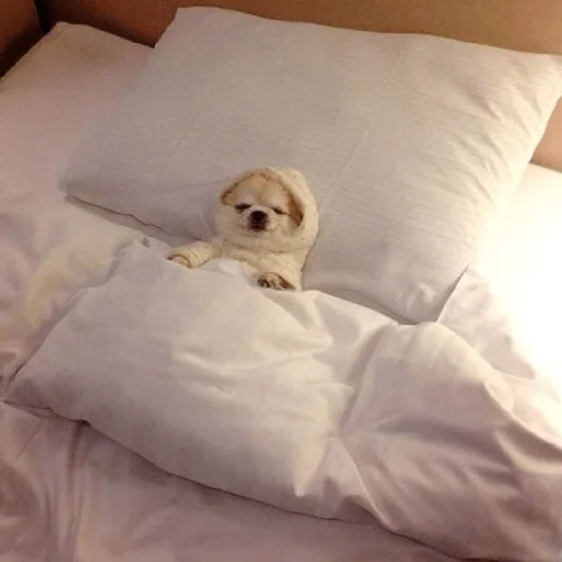 Cachorro deitado em uma cama com lençóis brancos, coberto até o pescoço, olhando para frente com expressão séria.