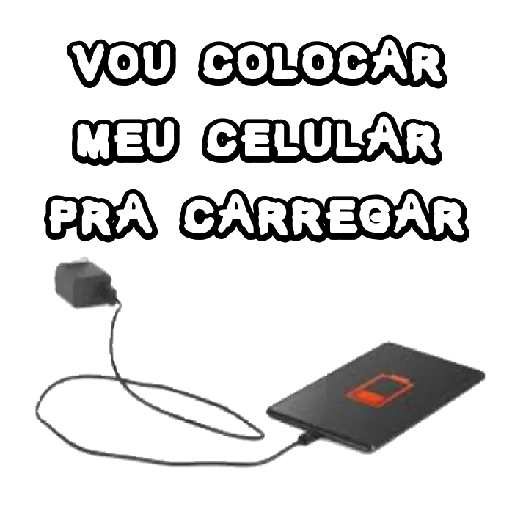 Um carregador de celular com um cabo conectado a um aparelho, e o texto "VOU COLOCAR MEU CELULAR PRA CARREGAR" em letras grandes.