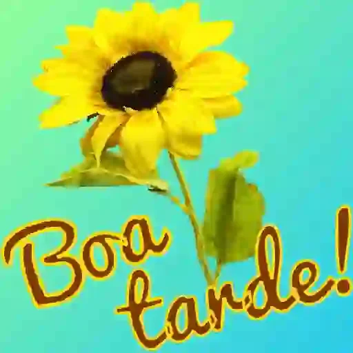 Uma flor de girassol amarela com folhas verdes e o texto 'Boa tarde!' em letras marrons cursivas sobre um fundo verde-azulado.
