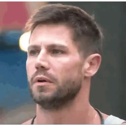 Rosto de um homem com expressão de surpresa ou incredulidade, vestindo uma camisa azul e vermelha.
