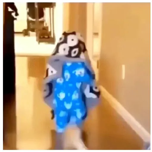 Um bebê deitado de bruços em um roupão azul com padrão de coraçãos, correndo em direção à câmera em um corredor.