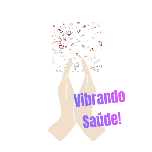 Mãos com as palmas juntas e dedos apontados para cima, soltando uma nuvem de partículas coloridas. O texto 'Vibrando Saúde!' aparece em roxo.