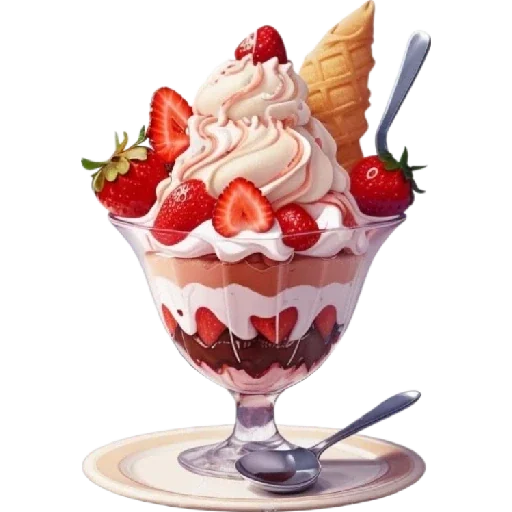 Sobremesa de morango com sorvete e calda em um copo alto, decorado com morangos frescos e um cone de sorvete ao lado.