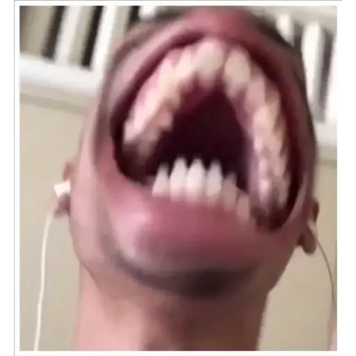 Rosto de uma pessoa com a boca aberta, mostrando os dentes e usando fones de ouvido.