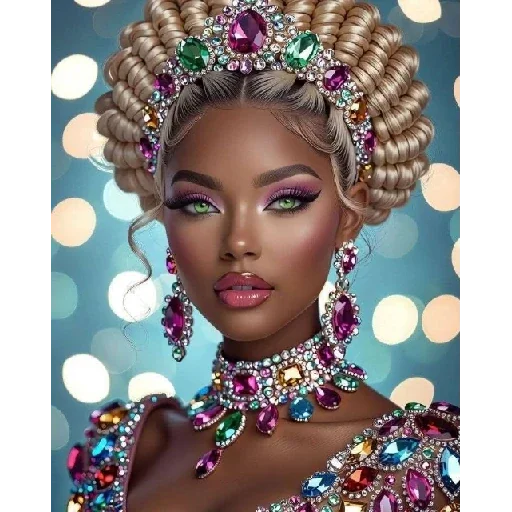 Uma mulher com uma fantasia de drag queen, usando uma coroa de joias, colar, pulseiras e maquiagem colorida. Ela tem um penteado volumoso e encaracolado.