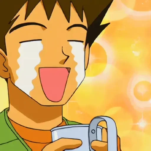 Personagem de anime com olhos fechados e língua para fora, segurando um celular, com lágrimas de alegria no rosto.