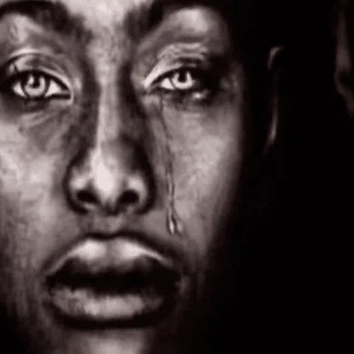 Rosto de uma pessoa com lágrimas nos olhos e uma expressão de tristeza ou choque, em preto e branco.
