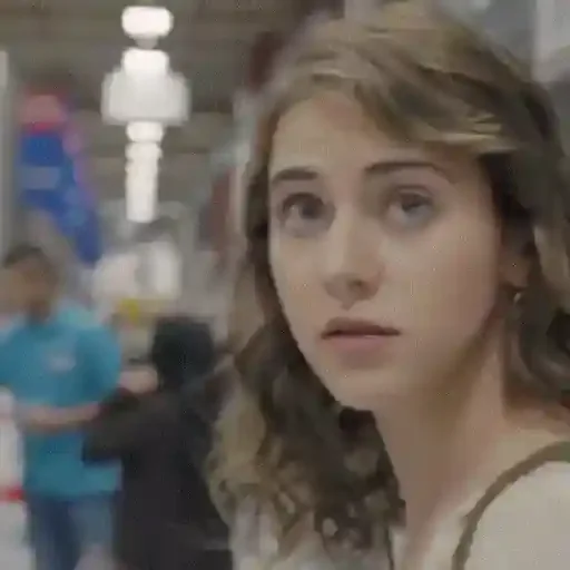 Uma jovem mulher com cabelos castanhos e expressão surpresa, possivelmente reagindo a algo fora da imagem.