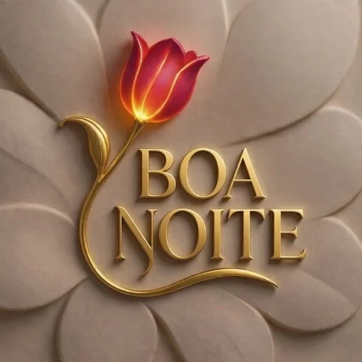 Uma flor vermelha com detalhes em amarelo e laranja emerge de um caule dourado, acompanhada das palavras 'BOA NOITE' em letras douradas.
