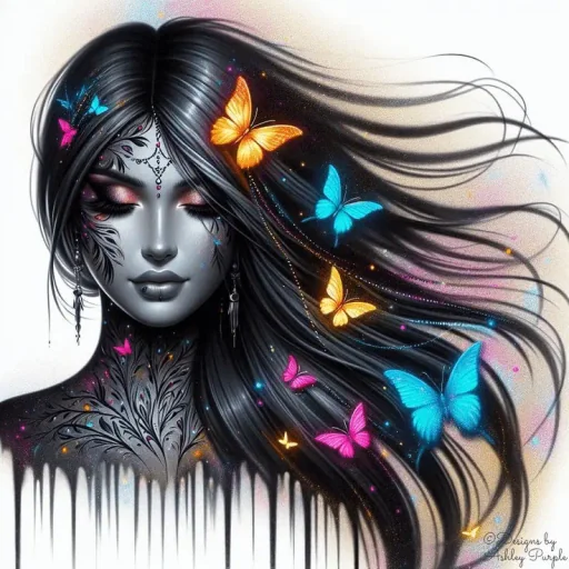 Uma mulher com cabelos longos e pretos e borboletas coloridas ao redor de sua cabeça e ombros. Ela tem olhos escuros e uma expressão misteriosa.