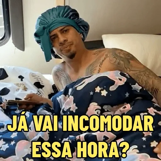 Homem deitado na cama, com touca verde na cabeça e braço tatuado, coberta com edredom de unicorninhos. Texto: 'JÁ VAI INCOMODAR ESSA HORA?'