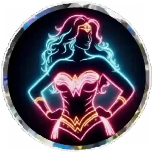 Uma mulher com um traje de superheroína, desenhada com linhas de neon rosa, azul e amarelo. Ela está com as mãos na cintura e tem um olhar confiante.