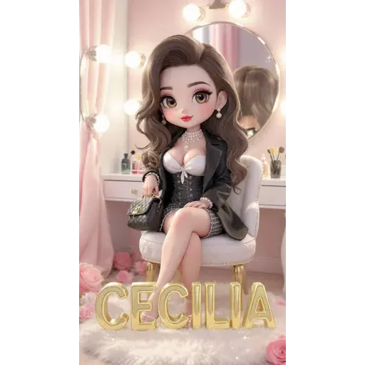 Uma mulher de cabelos castanhos sentada em uma cadeira diante de uma penteadeira com o nome 'Cecília' em letras douradas na frente. Ela está vestida com um blazer preto e lingerie branca.