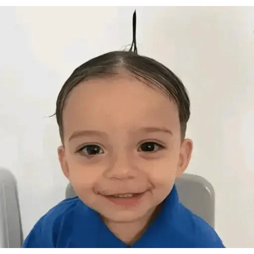 Menino sorrindo com um fio preto saindo do cabelo, vestindo uma camisa azul.