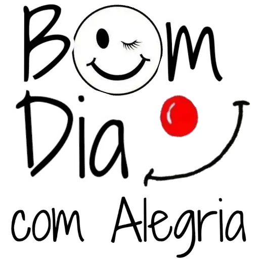 Um sorriso com um olho fechado e uma seta curva ao lado, com o texto 'Bom Dia, com Alegria' em letras grandes e pretas.