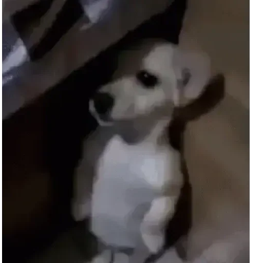 Cachorro branco com orelhas grandes e olhos pretos, em pé e olhando para cima.