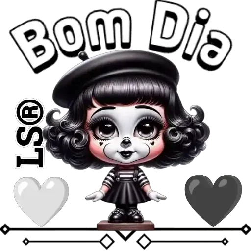 Uma figurinha de uma menina fofa com cabelo preto e um chapéu, com a frase 'Bom Dia' escrita em cima. Ela está com um vestido preto e listras brancas nas mangas. Há dois corações, um cinza e um preto, e a sigla 'LSG' ao lado esquerdo.