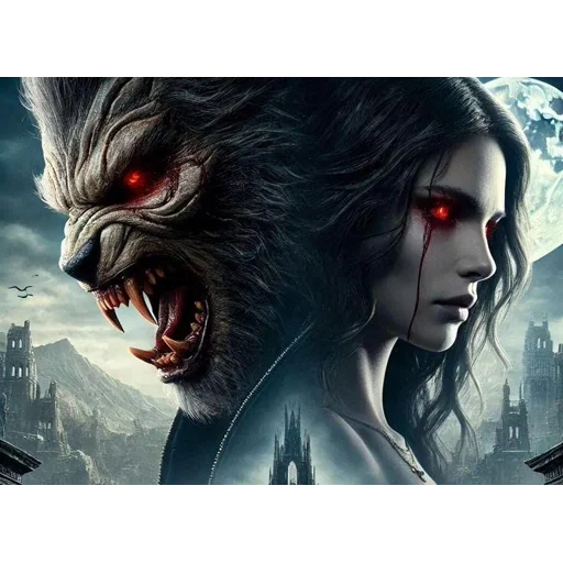 Uma mulher com olhos vermelhos e cabelos escuros ao lado de um lobisomem com olhos vermelhos e dentes afiados, em um cenário noturno sombrio com castelos ao fundo.