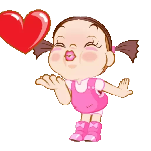Menina de olhos fechados com um coração vermelho ao lado, vestindo rosa e com os cabelos em coque duplo.