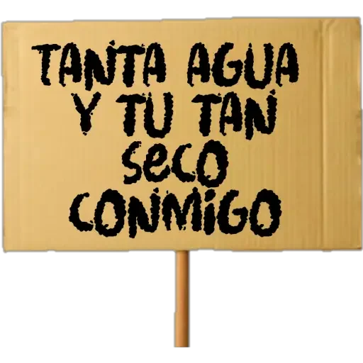 Placa de papelão com texto 'TANTA AGUA Y TU TAN SECO CONMIGO' em preto. A placa parece ter uma haste de madeira.