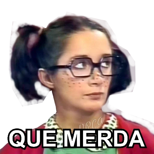 Menina com óculos e cabelo em coque, parecendo surpresa ou confusa, com a expressão 'QUE MERDA' em destaque.