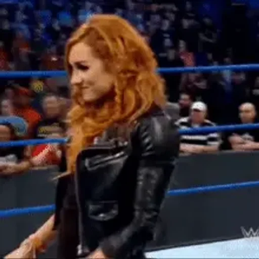 Mulher ruiva com jaqueta preta em um ringue de luta livre, com um público ao fundo.