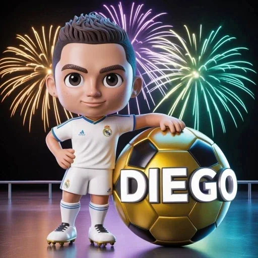 Menino de desenho animado com bola de futebol e fogos de artifício ao fundo. Ele usa uniforme branco e tem o nome 'DIEGO' na bola.