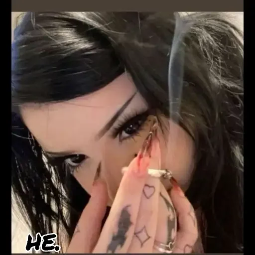 Uma mulher com cabelo preto e maquiagem pesada cobre o rosto com a mão, com anéis e tatuagens visíveis. Ela parece estar com dor ou surpresa. A imagem traz o texto 'HE.'