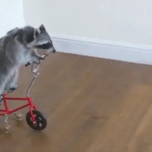 Um gambá cinza escuro está em uma bicicleta vermelha com uma roda dianteira pequena em um piso de madeira.