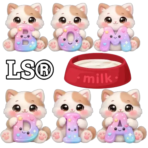 Seis gatinhos fofos de olhos grandes e pelagem laranja e branca segurando letras coloridas, ao lado de uma tigela vermelha com leite e a inscrição 'LS®'.