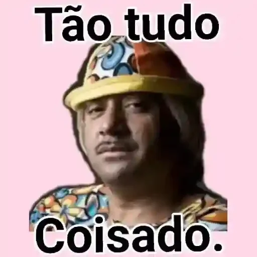 Um homem com expressão séria, usando um capacete e uma armadura coloridos, com o texto 'Tão tudo Coisado.'