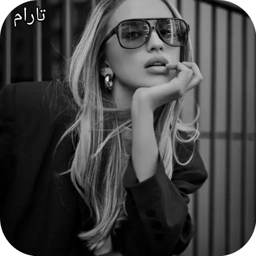 Mulher loira com óculos de sol e expressão pensativa, com o texto 'تارام' no canto superior esquerdo.