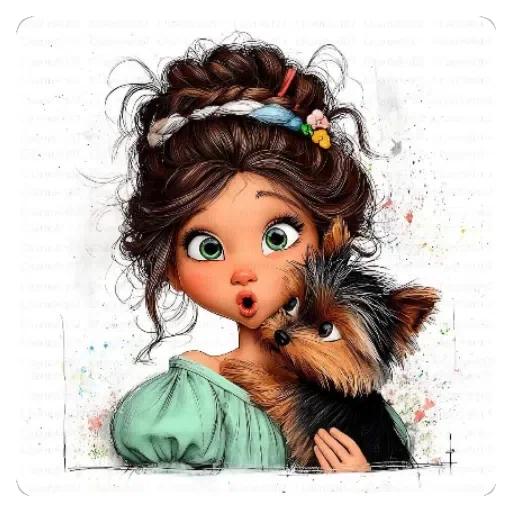 Menina com um cachorro fofo. Ela tem cabelo castanho com uma trança e um laço colorido, e veste uma blusa verde. O cachorro é castanho e preto.