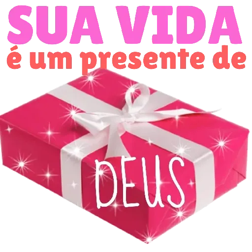 Um presente rosa com faixa branca e estrelas, com as palavras 'SUA VIDA é um presente de DEUS' em letras coloridas.