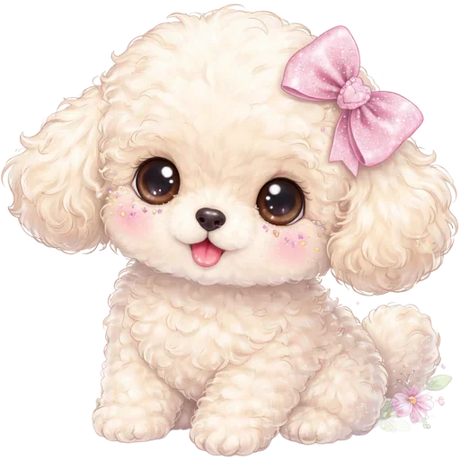 Cachorro poodle branco com laço rosa no cabelo e língua de fora, com olhos castanhos grandes e rosado nas bochechas.