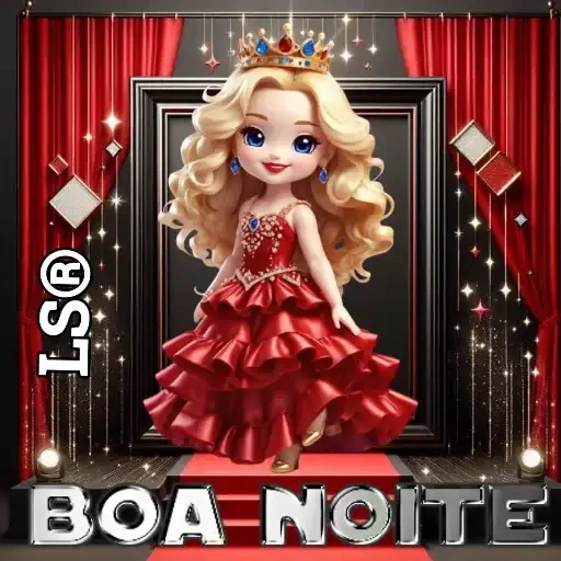 Uma boneca de desenho animado vestida com um vestido vermelho e uma coroa, em frente a uma porta preta com cortinas vermelhas. Abaixo dela está escrito 'BOA-NOITE'.