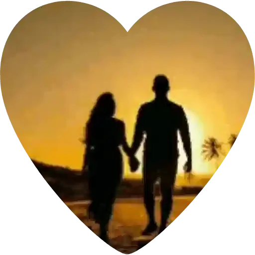Um casal de silhuetas segurando as mãos em um pôr do sol com palmeiras ao fundo, dentro de um coração.