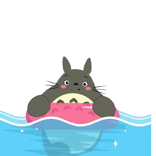 Totoro boiando na água com um donut rosa na boca